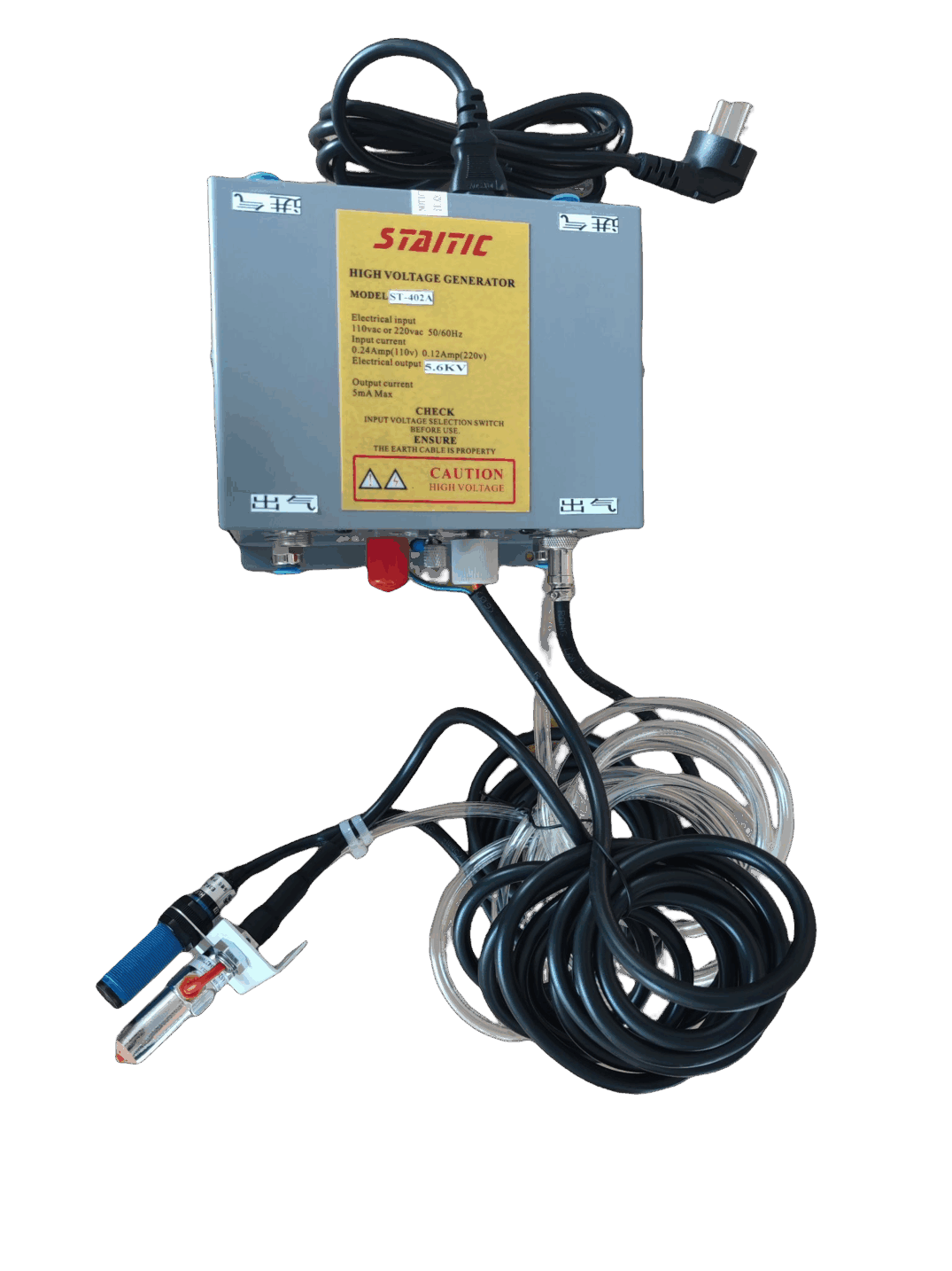 將風(fēng)嘴連接線(xiàn)末端插入高壓發(fā)生器高壓輸出插孔,順時(shí)針旋轉(zhuǎn)到頭,然后將風(fēng)嘴連線(xiàn)的接地線(xiàn)連接到高壓發(fā)生器外側(cè)的接地柱上,并確認(rèn)接地良好后,將高壓發(fā)生器的電源插頭插入帶有接地線(xiàn)的插座上(注意高壓發(fā)生器的使用電壓),將風(fēng)嘴固定安裝到合適的位置,插上壓縮氣管,打開(kāi)高壓發(fā)生器電源即可工作。
